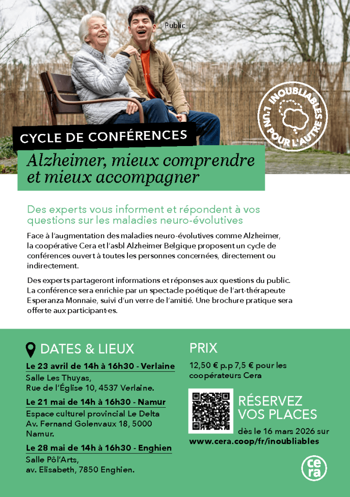 Dans le cadre de leur campagne de sensibilisation ‘Inoubliables, l’un pour l’autre’, nous organisons une conférence destinée à celles et ceux concernés (in)directement par ce type de maladie neuro-évolutive.