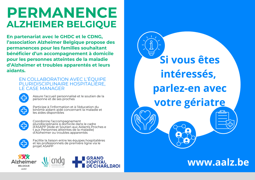 Dès ce mois de mars, Alzheimer Belgique asbl tiendra une permanence mensuelle au sein du Grand Hôpital de Charleroi et de la Clinique Notre-Dame de Grâce (asbl) à Gosselies.